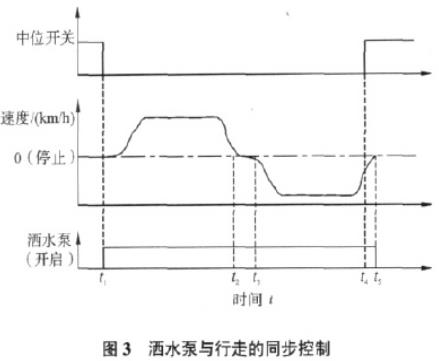 同时用行驶速度加以校正,如果中位信号消失一段时间后仍没有速度,则停止洒水,避免由于开关失灵误洒水而造成浪费。